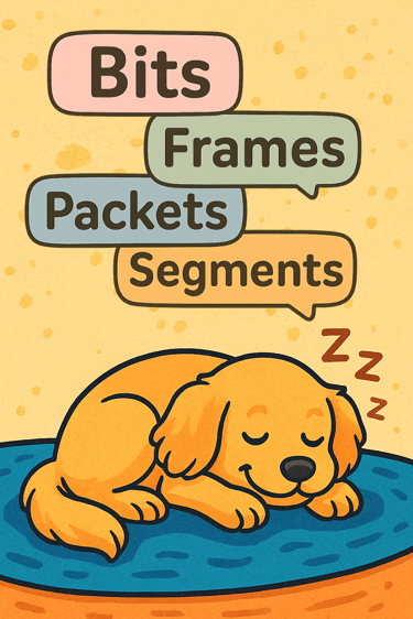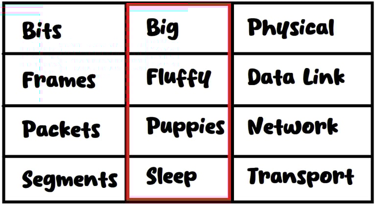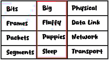 While there are no actual puppies for this one, this is how I've been able to remember Bits - Frames - Packets - Segments.