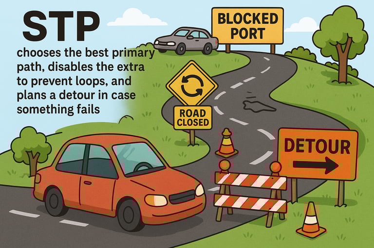 This is what STP does for us in the network: It acts as a traffic control system for our networks, choosing the best primary path, blocking redundant connections to prevents loops, and keeps a detour in case something fails.